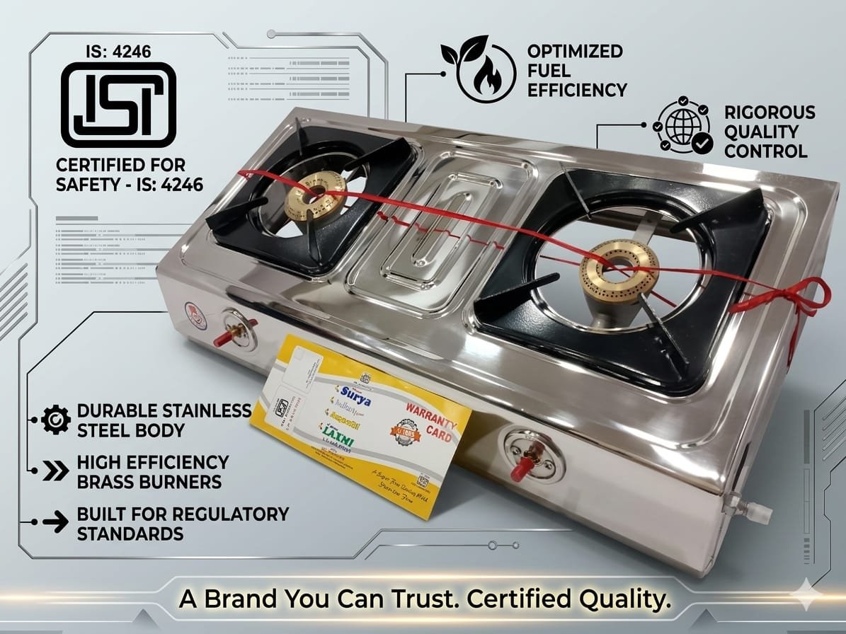 This gas stove is BIS certified (IS: 4246), ensuring top-notch safety and quality standards. The smooth and sturdy control knobs allow precise flame adjustment, while the strong pan supports ensure stability for all types of cookware.