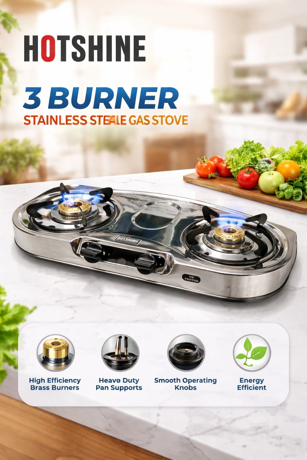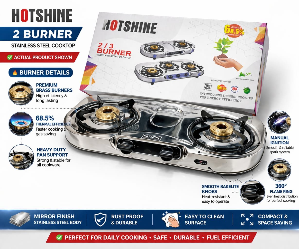 Make cooking faster, safer, and more efficient with the Hotshine 2-Burner Stainless Steel Gas Stove—a perfect combination of performance, durability, and modern design. Built with a mirror-finish stainless steel body, this gas stove not only looks elegant but is also rust-proof, long-lasting, and easy to maintain.