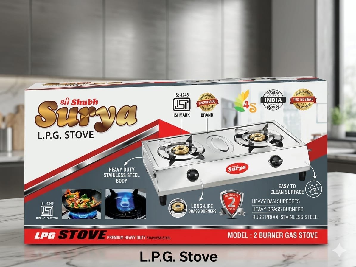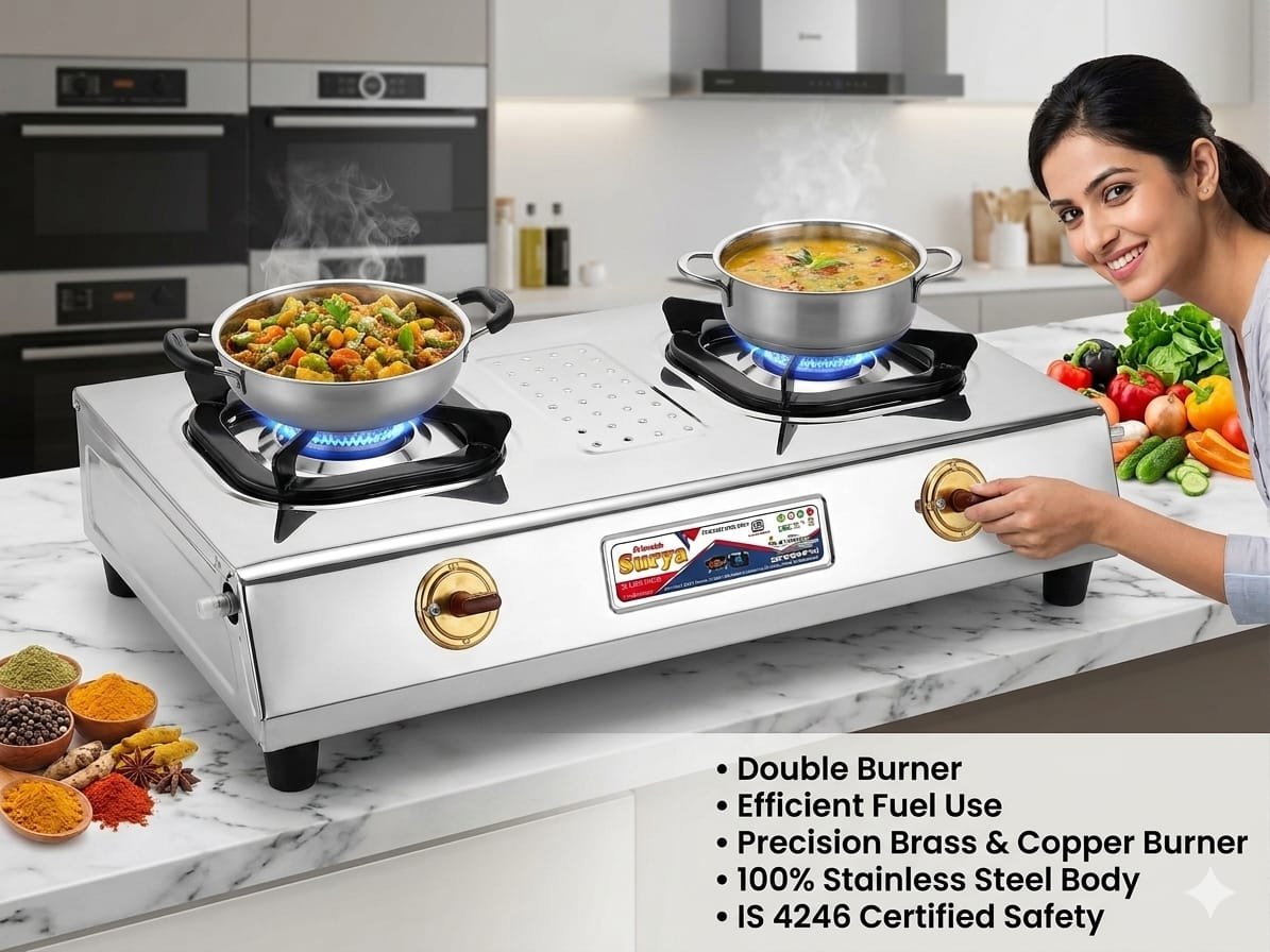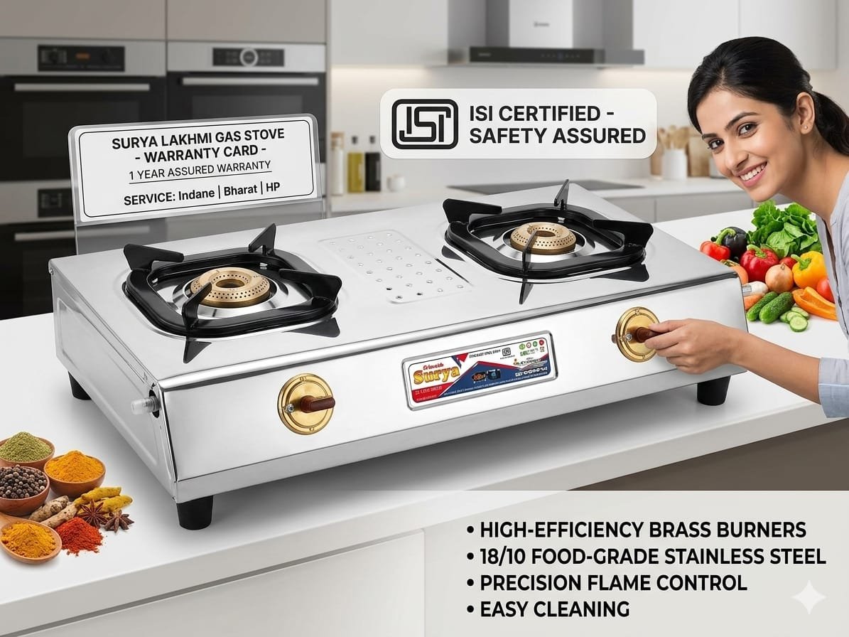 Upgrade your kitchen with the Raj Home Surya Matchless 2 Burner Gas Stove. Designed with a durable stainless steel body and high-efficiency brass burners, it delivers powerful, even flames for faster cooking. ISI certified for safety and built for everyday convenience.