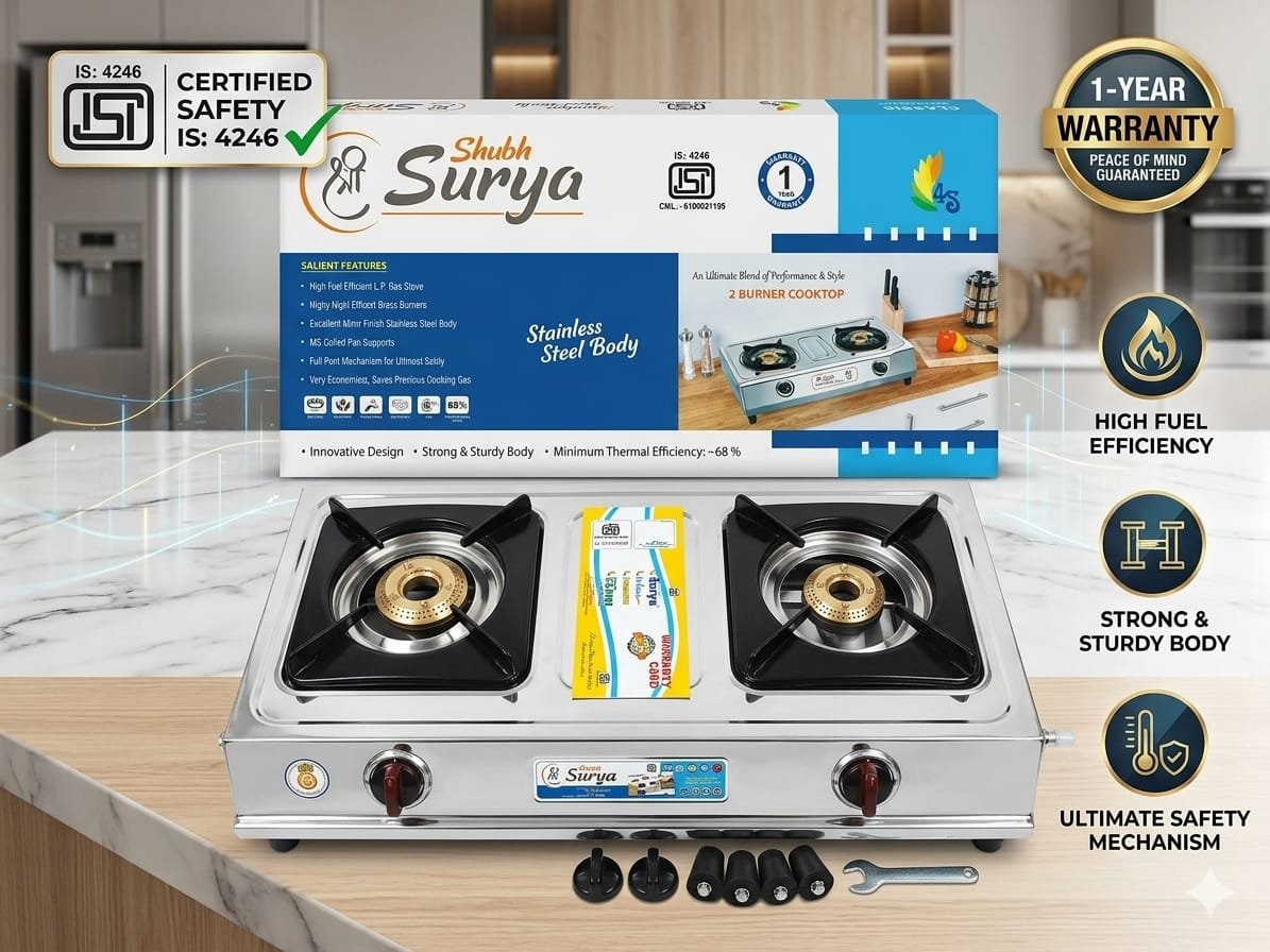 Upgrade your kitchen with the Raj Home Surya Max 2 Burner Gas Stove, designed to deliver maximum efficiency, safety, and durability for everyday cooking.
