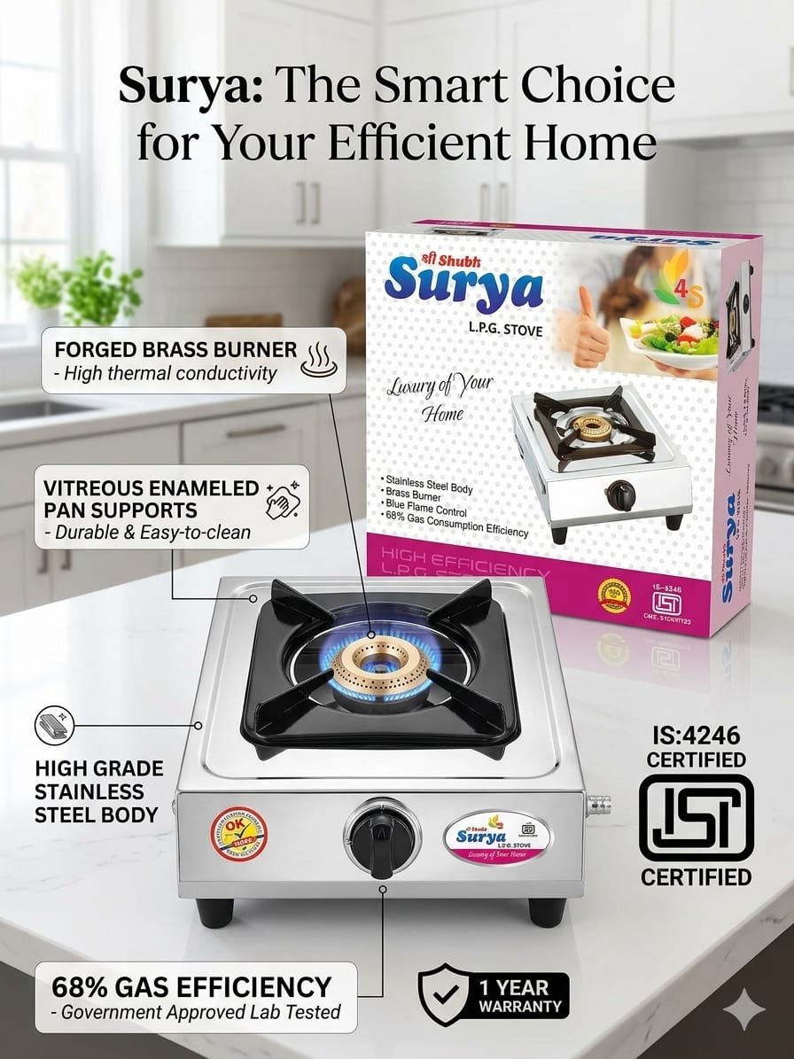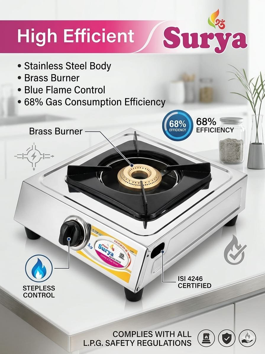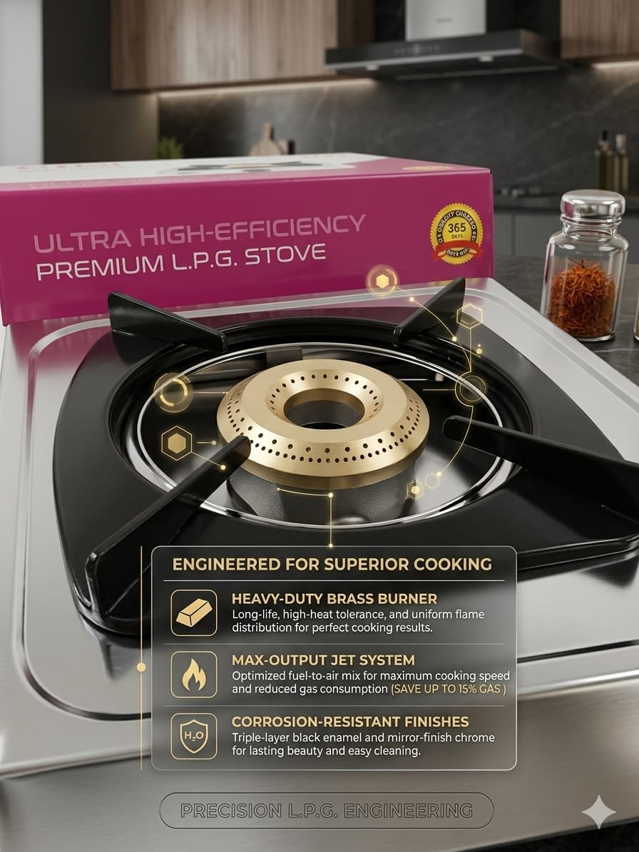 Featuring a high-grade stainless steel body, the stove is resistant to rust, easy to clean, and built for long-lasting durability. The forged brass burner ensures excellent thermal conductivity, providing uniform heat distribution for faster and more efficient cooking.